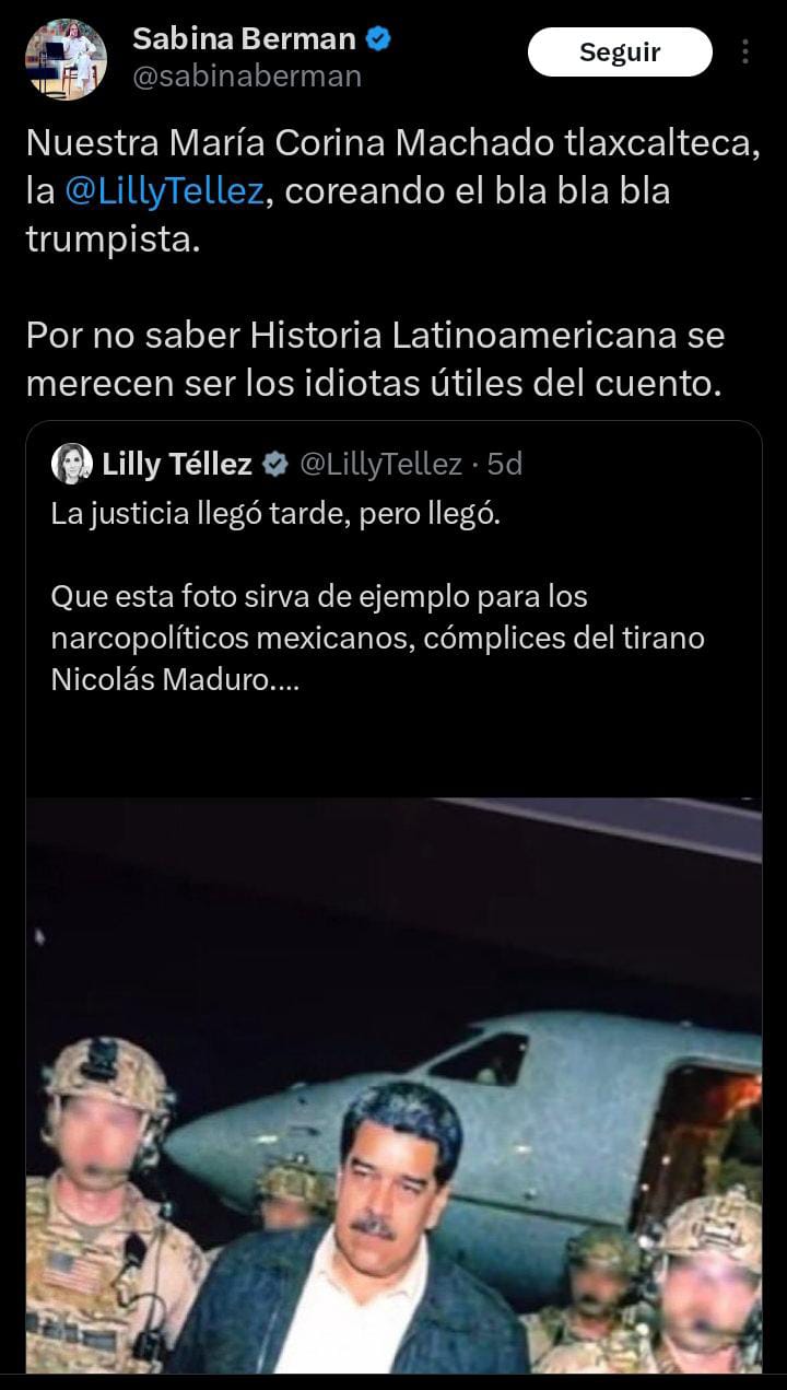 En respuesta, Sabina Berman arremetió en su contra usando el gentilicio de Tlaxcala de manera despectiva, «Nuestra María Corina Machado tlaxcalteca, la @LillyTellez, coreando el bla bla bla trumpista. Por no saber Historia Latinoamericana se merecen ser los idiotas útiles del cuento».