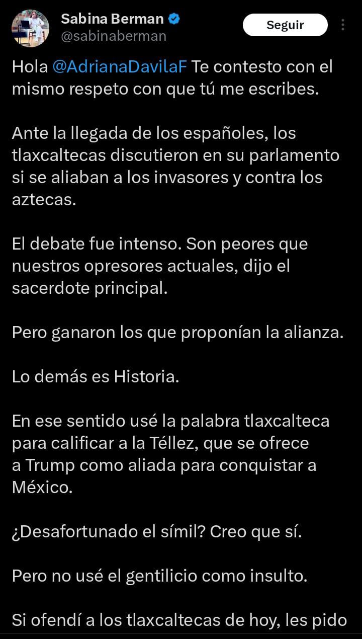 El asunto no paró ahí ya que Berman continuó la discusión al escribir «…usé la palabra tlaxcalteca para calificar a la Téllez, que se ofrece a Trump como aliada para conquistar a México…Pero no usé el gentilicio como insulto.
