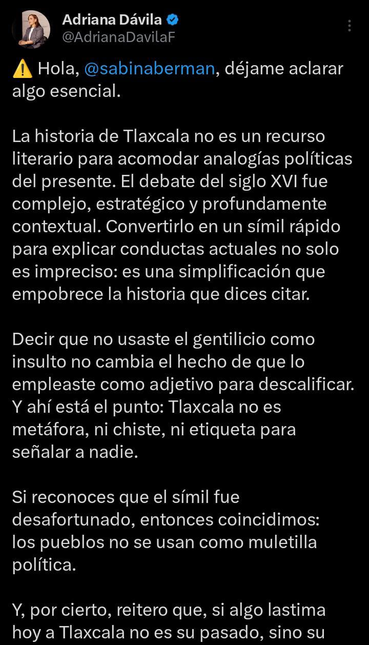 La panista posteó «Como orgullosa tlaxcalteca, aclaro dos cosas @sabinaberman… Tlaxcala no es insulto ni muletilla retórica. Usar “tlaxcalteca” como burla —además de incorrecto— revela prejuicios e ignorancia, no argumentos»