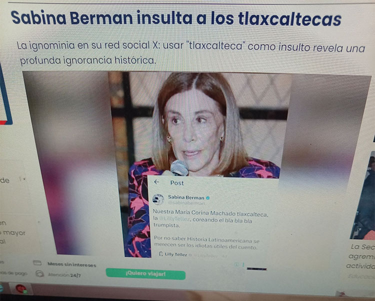Ahora le toca su preciado turno a la señora, Sabina Berman, quien escribió en un Twitter en X, que los tlaxcaltecas, ‘somos traidores’, al aludir directamente que Lily Tellez, derechista panista y senadora proempresarial y a la venezolana, conservadora millonaria , de origen burgués, Corina Machado, desde el enfoque histórico de México.
