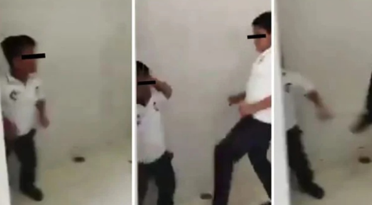 Las imágenes muestran a varios estudiantes uniformados que patean y acorralan al alumno, quien se encuentra en un rincón del plantel e intenta cubrirse de los golpes con las manos.