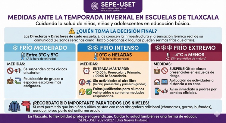 Este lunes, para el regreso a clases luego del descanso decembrino, el titular de la Secretaría de Educación Pública del Estado (SEPE), Homero Meneses Hernández, difundió una infografía para difundir las medidas ante la temporada invernal, entre las que se incluye el retraso de ingreso a las escuelas, la posible suspensión de clases presenciales o la cancelación de actos cívicos.