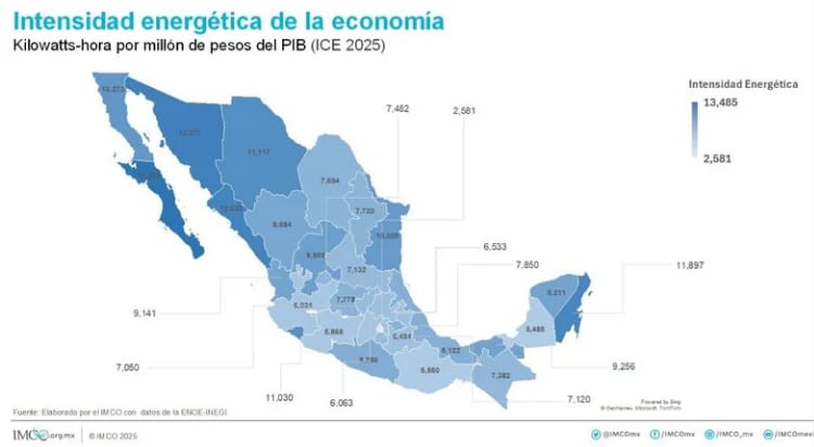 El Índice de Intensidad Energética de la Economía (ICE 2025) muestra que Tlaxcala registra un nivel intermedio de consumo energético por cada millón de pesos del Producto Interno Bruto, de acuerdo con datos del Instituto Mexicano para la Competitividad (IMCO), elaborados con información de la ENOE-INEGI.