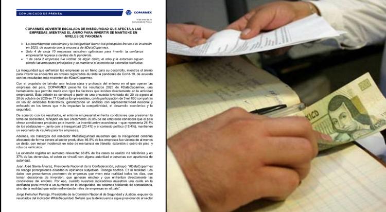 A través de un comunicado de prensa emitido el 14 de enero de 2026, la Confederación Patronal de la República Mexicana (COPARMEX) advirtió que la inseguridad, la corrupción y la incertidumbre económica continúan siendo factores determinantes que limitan el desarrollo del sector empresarial en el país, manteniendo el ánimo para invertir en niveles similares a los registrados durante la pandemia de Covid-19.