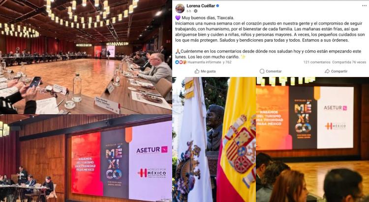 Mensaje matutino en redes sociales contrasta con la agenda internacional de Lorena Cuéllar en Madrid; Comunicación Social no aclaró su ubicación.