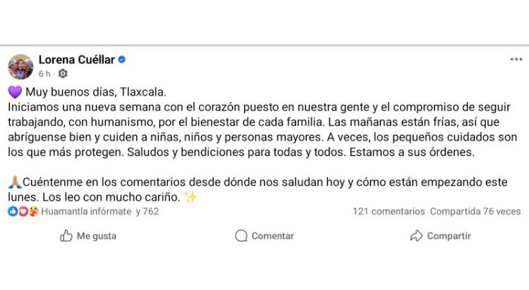 El mensaje, publicado como saludo matutino dirigido a la población de Tlaxcala, hacía referencia a las bajas temperaturas en el estado y a la cercanía con la gente, sin mencionar que la gobernadora ya se encontraba fuera del país como parte de la comitiva que participa en FITUR 2026, evento que se llevará a cabo del 21 al 25 de enero en Madrid y en el que México será el país invitado, junto con la presencia de los 32 gobernadores del país y diversos expositores.