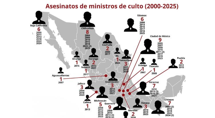 Entre los años 2000 y 2025, un total de 84 ministros de culto de distintas religiones han sido asesinados en México, de acuerdo con el análisis del periodista Víctor Manuel Sánchez Valdés, respaldado por un mapa estadístico que documenta la distribución de estos homicidios por entidad federativa.