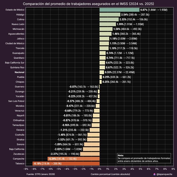 El contraste regional resulta evidente al observar que varios estados reportaron caídas en su promedio de asegurados, destacando Tabasco (-8.18%), Campeche (-6.34%) y Zacatecas (-2.37%), lo que revela una desaceleración del empleo formal en distintas zonas del país.