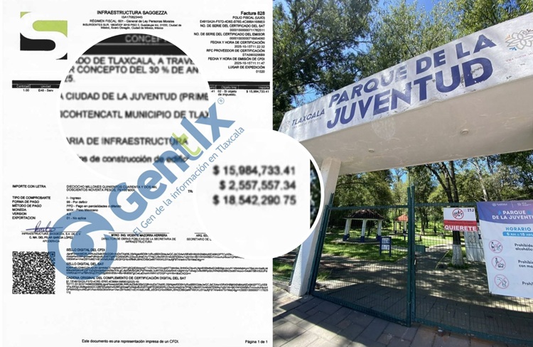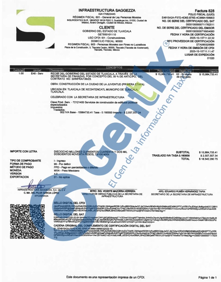La empresa ‘Infraestructura Saggezza’ de la Ciudad de México fue la beneficiaria del contrato millonario para ejecutar el proyecto del Gobierno de Tlaxcala denominado ‘Ciudad de la Juventud’, en su primera etapa, la cual recibió un adelanto del 30 por ciento de la inversión total, así lo evidenció la Factura 828, por un monto de 18 millones 542 mil 290.75 pesos.