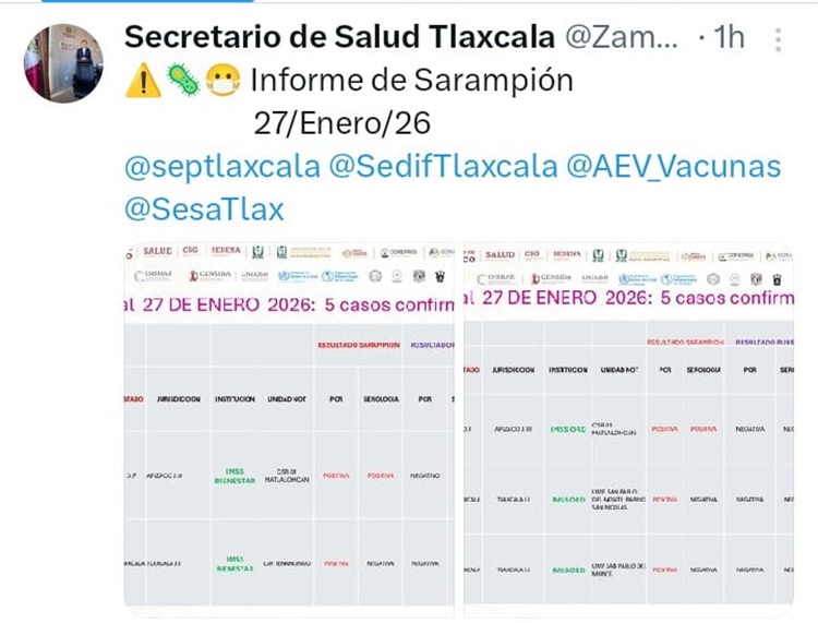 Zamudio Meneses publicó en su cuenta de «X» los informes del comportamiento de la enfermedad en Tlaxcala, donde se dieron a conocer los tres casos positivos identificados recientemente. En todos ellos, se han implementado cercos sanitarios para completar los esquemas de vacunación en la población cercana a los casos identificados.