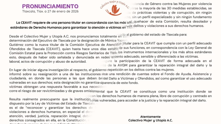 El Colectivo Mujer y Utopía (CMU), emitió un comunicado reprochando a la electa de Movimiento Regeneración Nacional (MORENA) en Tlaxcala, la designación de Mónica Jiménez ya que no sólo cuenta con dichas acusaciones en su contra, sino que carece de la experiencia indispensable para el nuevo cargo.