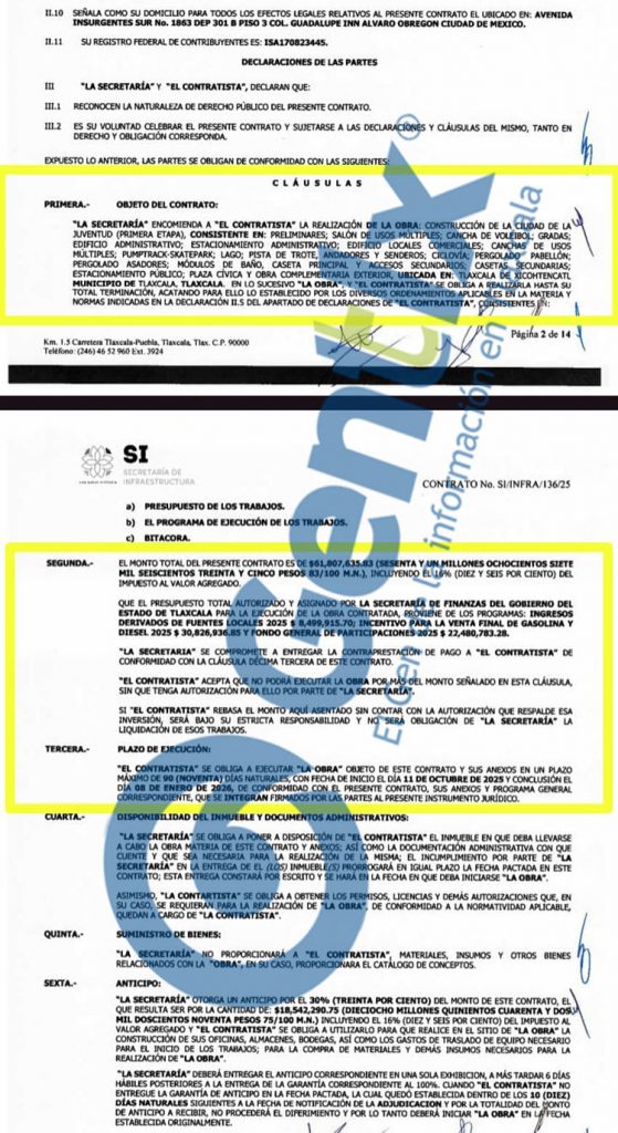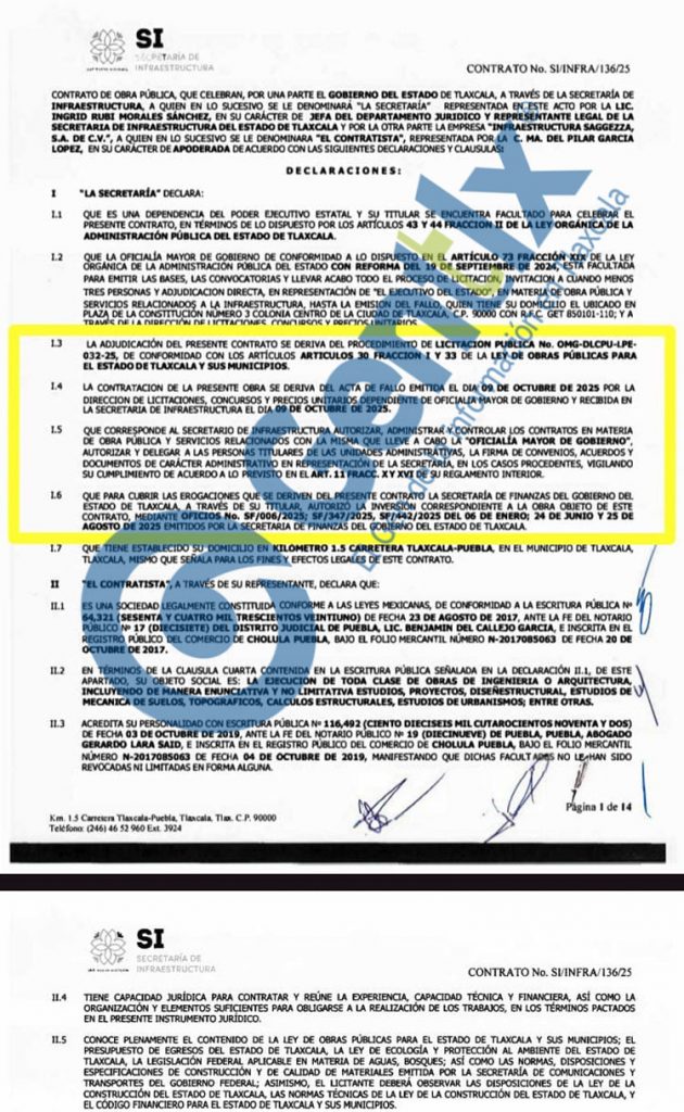 El contrato está avalado por la Secretaría de Infraestructura (SI), la de Finanzas (SF) y la Oficialía Mayor de Gobierno (OMG), responsables de la adjudicación del proyecto tras la “licitación pública” OMG-DLCPU-LPE-032-25 resuelta el 09 de octubre de 2025.