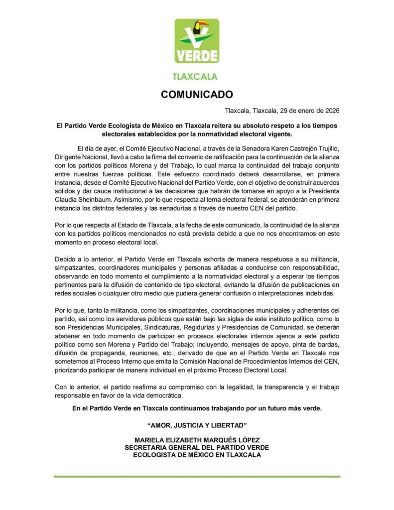 Mariela Elizabeth Marqués López, Secretaria General del Partido Verde Ecologista de México (PVEM) emitió un comunicado respecto a la ratificación de la alianza partidista con MORENA y el PT a nivel nacional, resaltando que en Tlaxcala dicha coalición no está prevista y llamó a la militancia del partido a “conducirse con responsabilidad”.