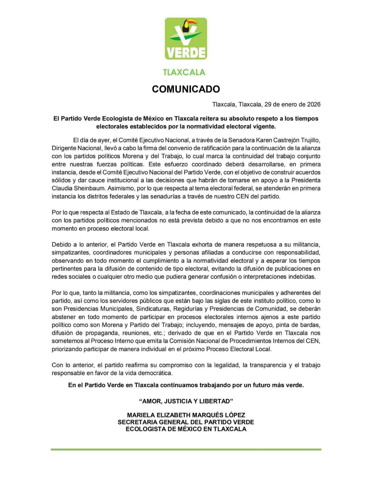 Mariela Elizabeth Marqués López, Secretaria General del Partido Verde Ecologista de México (PVEM) emitió un comunicado respecto a la ratificación de la alianza partidista con MORENA y el PT a nivel nacional, resaltando que en Tlaxcala dicha coalición no está prevista y llamó a la militancia del partido a “conducirse con responsabilidad”.