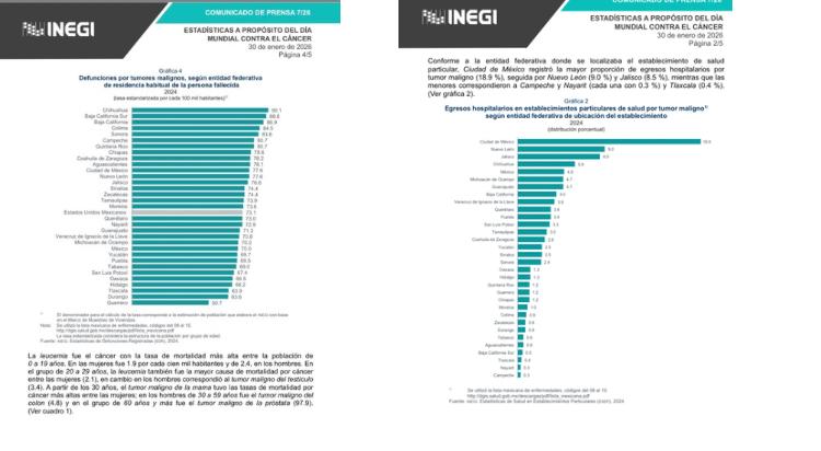 El informe también señala que la leucemia fue el tipo de cáncer con mayor tasa de mortalidad entre la población de 0 a 19 años, mientras que en adultos mayores de 60 años y más, el cáncer de próstata encabezó las causas de muerte en hombres, y el cáncer de mama predominó en mujeres a partir de los 30 años.