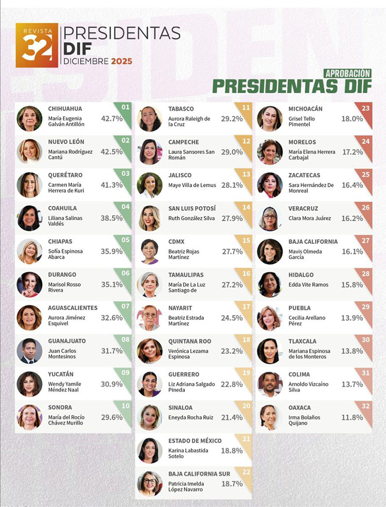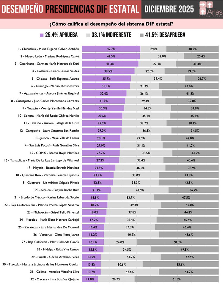 Es de precisar que, de acuerdo con la medición de diciembre de 2025 de “Arias Consultores” publicada en la “Revista 32”, Mariana Espinosa tuvo una aprobación en noviembre de 12.4 por ciento, lo que le valió mantenerse como la segunda peor evaluada del país, igual que en octubre.