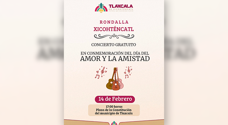 El Gobierno Municipal de Tlaxcala, que preside Alfonso Sánchez García, invita a la ciudadanía en general al concierto gratuito de la Rondalla Xicohténcatl, que se llevará a cabo el próximo sábado 14 de febrero a las 17:00 horas en la Plaza de la Constitución, como parte de las celebraciones por el Día del Amor y la Amistad.