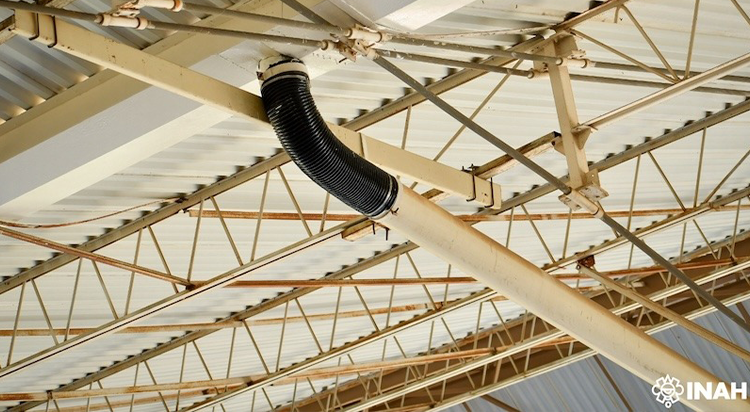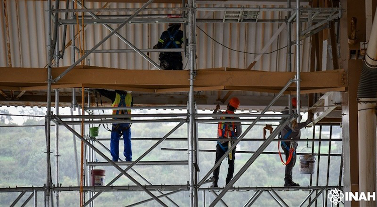 Las tareas, supervisadas por las secciones de Arqueología, Restauración y Monumentos Históricos del Centro INAH, se enfocaron en la sustitución de canalones de desagüe y mantenimiento de algunas láminas de acero galvanizado en mal estado, así como de las conexiones de bajantes de agua pluvial, limpieza y pintura de la estructura de acero.