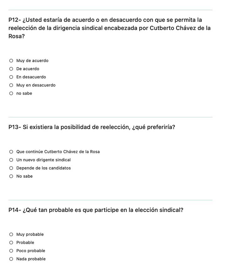 “¿Usted estaría de acuerdo o en desacuerdo con que se permita la reelección de la dirigencia sindical encabezada por Cutberto Chávez De la Rosa” es la primera pregunta, dando la oportunidad de responder con opción múltiple.