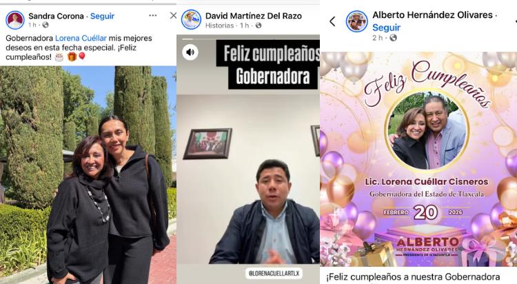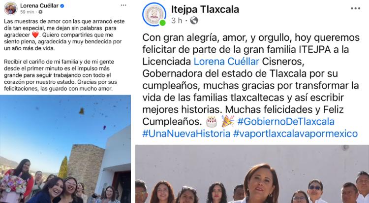 Entre los mensajes difundidos en cuentas oficiales se encuentra el del Instituto Tlaxcalteca para la Educación de los Jóvenes y Adultos (ITEJPA), que expresó: “Con gran alegría, amor y orgullo, hoy queremos felicitar de parte de la gran familia ITEJPA a la Licenciada Lorena Cuéllar Cisneros, Gobernadora del estado de Tlaxcala por su cumpleaños, muchas gracias por transformar la vida de las familias tlaxcaltecas y así escribir mejores historias. Muchas felicidades y Feliz Cumpleaños”.