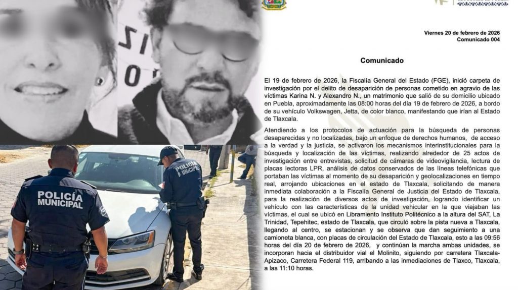 El 19 de febrero de 2026, la Fiscalía General del Estado (FGE), inició carpeta de investigación por el delito de desaparición de personas cometido en agravio de las víctimas Karina N. y Alexandro N., un matrimonio que salió de su domicilio ubicado en Puebla, aproximadamente a las 08:00 horas del día 19 de febrero de 2026, a bordo de su vehículo Volkswagen, Jetta, de color blanco, manifestando que irían al Estado de Tlaxcala.