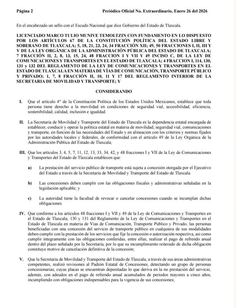 “Se cancelan de manera definitiva las concesiones del servicio público de transporte del Estado de Tlaxcala en las modalidades de taxi y colectivo que se detallan en el presente Acuerdo, toda vez que se encuentran depositadas y registran adeudos de cinco o más años en el pago del refrendo anual”.