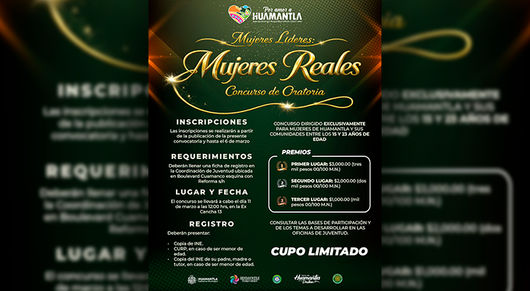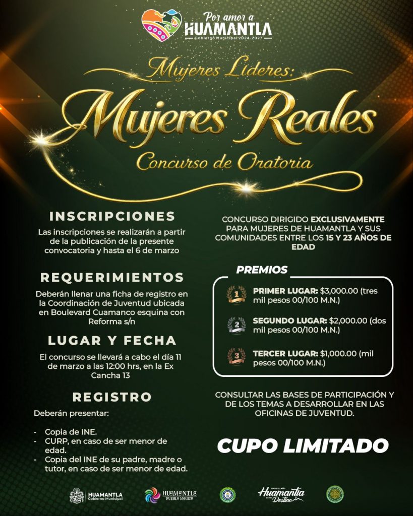 Con el objetivo de impulsar la participación, el liderazgo y la expresión de las jóvenes huamantlecas, el Gobierno Municipal de Huamantla, a través de la Coordinación de Juventud, invita a participar en la convocatoria para el concurso de oratoria “Mujeres Líderes: Mujeres Reales”, dirigido a mujeres del municipio y sus comunidades.