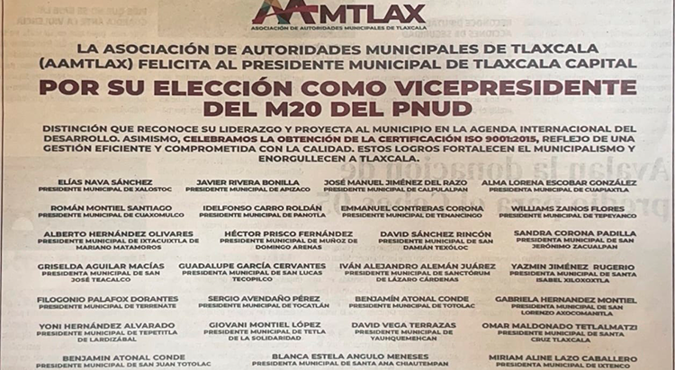 De acuerdo con este documento, el espaldarazo ocurrió porque Sánchez García fue electo como Vicepresidente del M20 del Programa de las Naciones Unidas para el Desarrollo (PNUD), una distinción internacional que integra a la capital a la agenda global del desarrollo sostenible y proyecta a Tlaxcala internacionalmente.