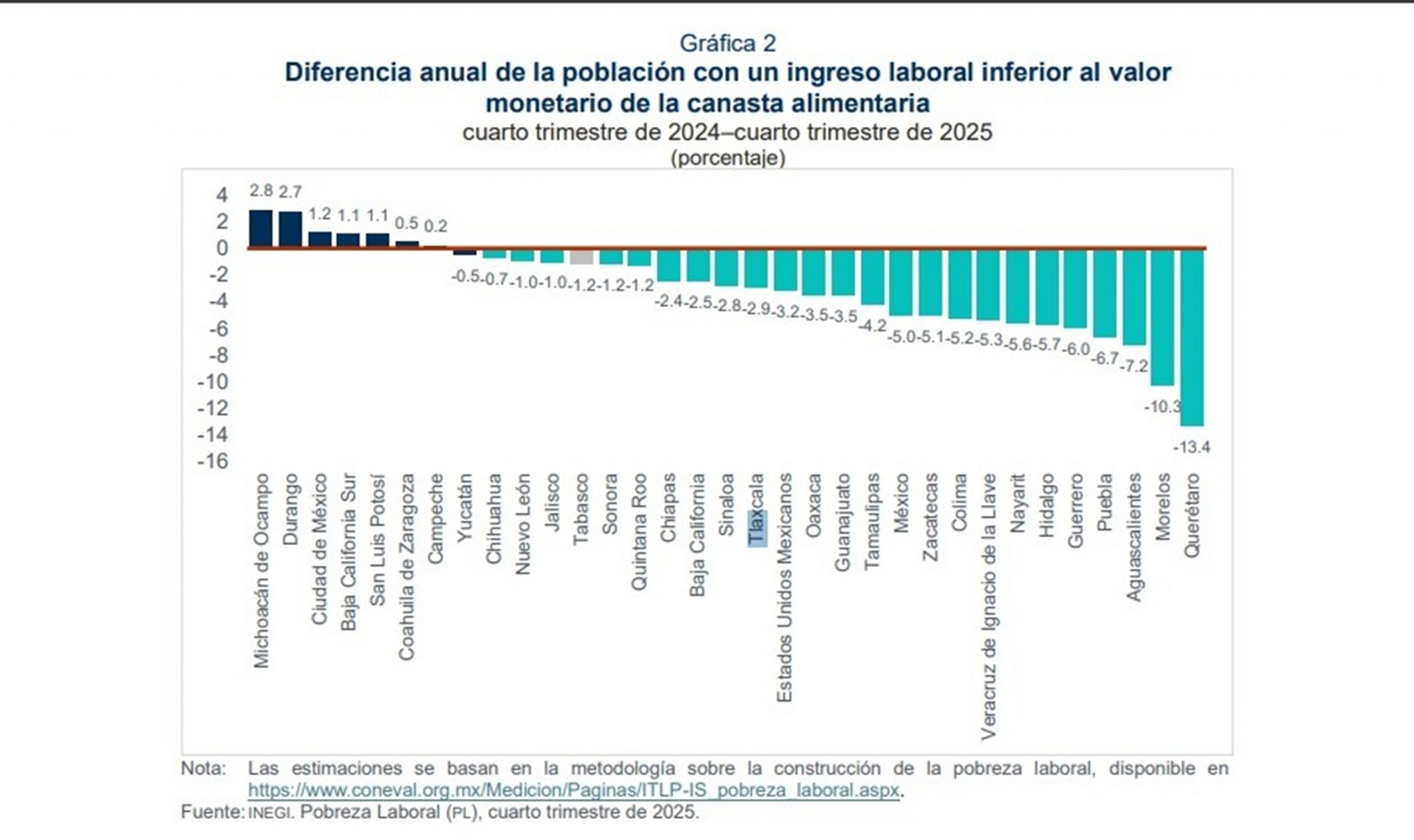 Del cuarto trimestre de 2024 al cuarto trimestre de 2025, el Instituto Nacional de Estadística y Geografía (INEGI) midió los indicadores y cifras de la Pobreza Laboral, evidenciando que las y los tlaxcaltecas ganan 2.9 por ciento menos del costo de la canasta básica, ubicando a la entidad entre aquellos con las cifras más altas de Pobreza Laboral.