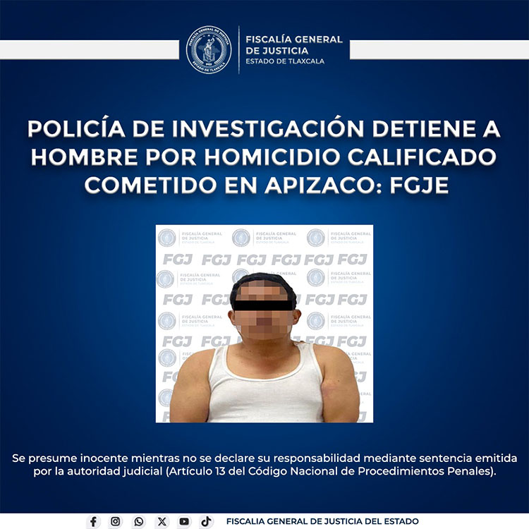 Las labores de inteligencia realizadas por la Policía de Investigación de la Fiscalía General de Justicia del Estado (FGJE) permitieron la detención de Raúl N., por su probable responsabilidad en el delito de homicidio calificado, ocurrido en el municipio de Apizaco.