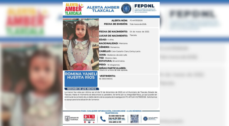 Aunque Romina Yaneli Huerta Ríos, de 4 años de edad, desapareció desde el pasado 10 de diciembre de 2025, la Fiscalía Especializada en Personas Desaparecidas y No Localizadas (FEPDNL) emitió una Alerta Amber hasta el 11 de marzo; a la fecha, la infanta sigue sin ser localizada.