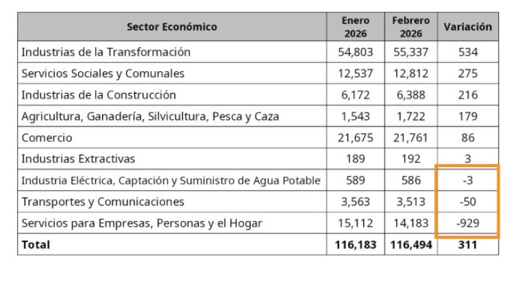 Al igual que en enero, “Servicios para Empresas, Personas y el Hogar” fue el Sector Económico de mayor contracción del empleo con 929 puestos menos, mientras que en el mes inmediato anterior fueron mil 389 trabajadores asegurados los que fueron dados de baja.