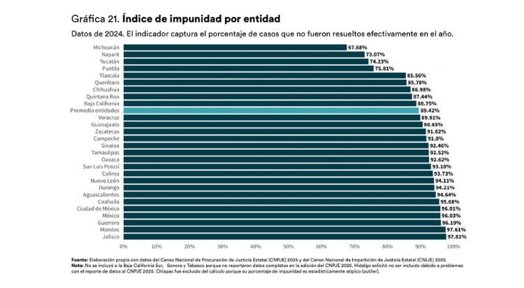 En contraste, entidades como Michoacán (67.68%) y Nayarit (73.07%) registraron menores niveles de impunidad, mientras que en el extremo opuesto se encuentran Jalisco (97.81%), Morelos (97.61%) y el Estado de México (96.03%), con los porcentajes más elevados.