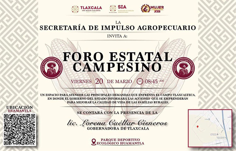 El encuentro, convocado por la Secretaría de Impulso Agropecuario (SIA), se llevará a cabo este viernes 20 de marzo a las 08:45 horas en el Parque Deportivo Ecológico de Huamantla y contará con la presencia de la gobernadora del estado, Lorena Cuéllar Cisneros.
