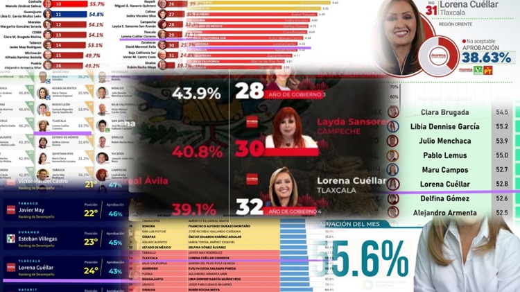 La electa de Movimiento Regeneración Nacional (MORENA) en Tlaxcala, Lorena Cuéllar Cisneros, llegó al primer lugar de los gobernadores peor evaluados del país con una aprobación de 38.8 por ciento, según la encuesta de febrero de “GobernArte”, no obstante, en la medición de “FactoMétrica” tuvo un 31.1 por ciento.