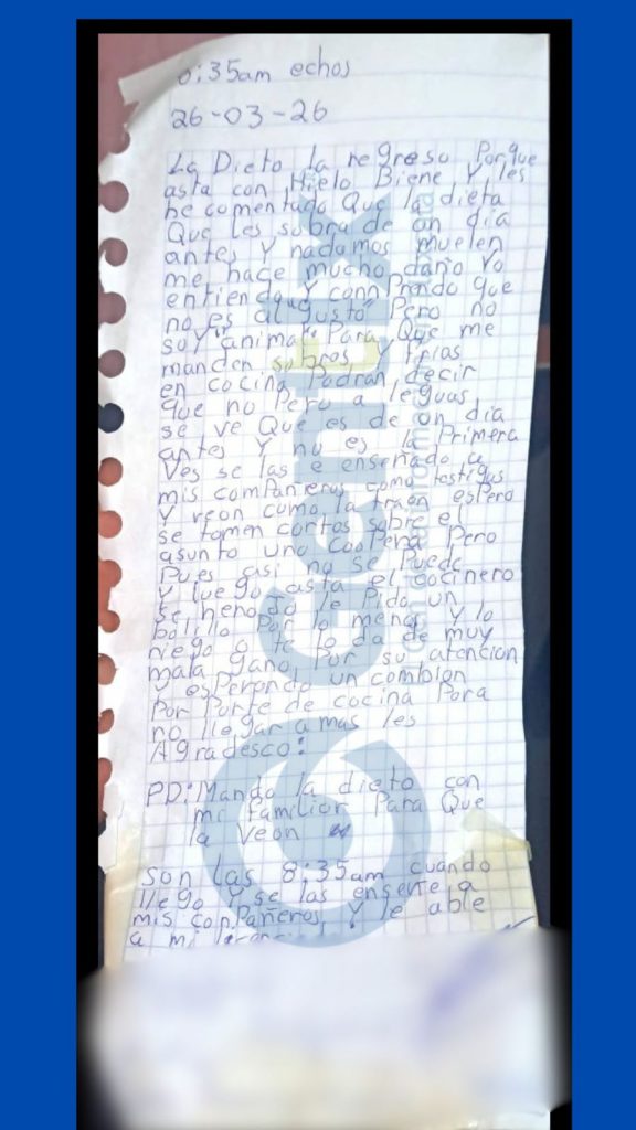 De acuerdo con testimonios, incluso de uno de los internos hecho llegar a este medio por escrito, los acontecimientos más recientes se registraron este jueves a las 8:35 horas, cuando una Persona Privada de su Libertad (PPL) recibió alimentos en mal estado, los cuales según se describe, habrían sido preparados con días antes y almacenados, por lo cual fueron servidos fríos e incluso con hielo, lo que generó inconformidad debido a posibles afectaciones a la salud.