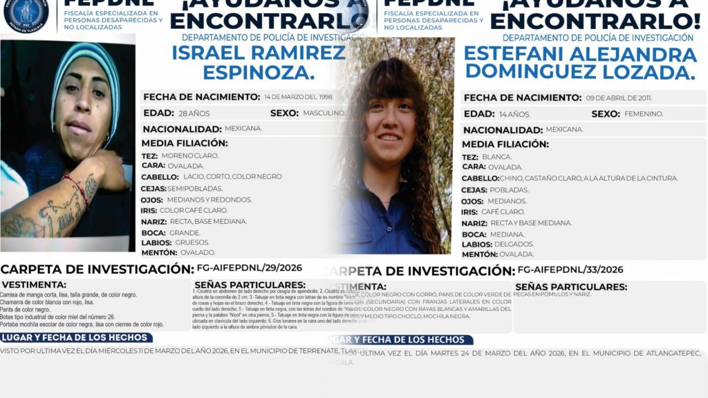 Sin embargo, se mantienen las labores de búsqueda por Israel Ramírez Espinoza, de 18 años de edad, desaparecido desde el 11 de marzo de 2026, en el municipio de Terrenate; y por Estefani Alejandra Domínguez Lozada, de 14 años, reportada como desaparecida desde el 24 de marzo de este año, en Atlangatepec.