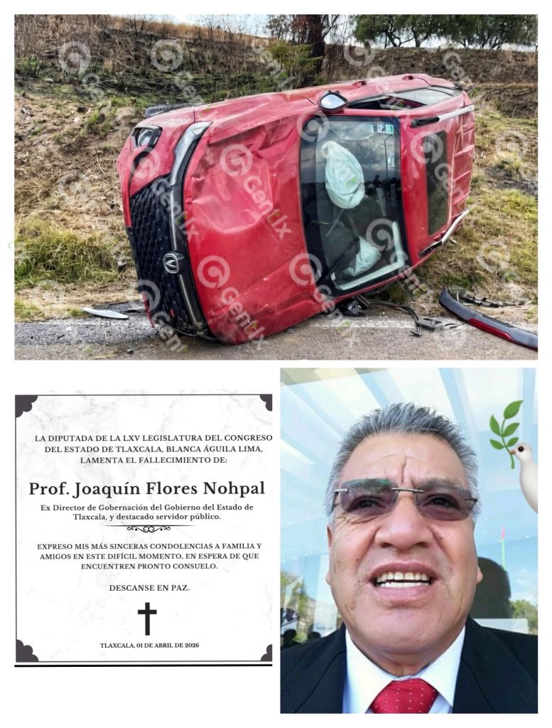 El exdirector de Gobernación de Tlaxcala, Joaquín Flores Nophal, perdió la vida la tarde de este miércoles tras sufrir una aparatosa volcadura en la carretera Metepec-Zacualpan. A pesar de haber sido trasladado con vida al hospital del ISSSTE en la capital del estado, la gravedad de sus heridas resultó fatal horas después de su ingreso.
