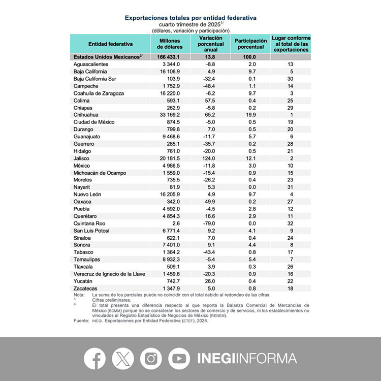 A nivel nacional, México alcanzó un total de 166 mil 433.1 millones de dólares en exportaciones, con un crecimiento anual del 13.8%, lo que subraya aún más el rezago de estados con baja participación como Tlaxcala.