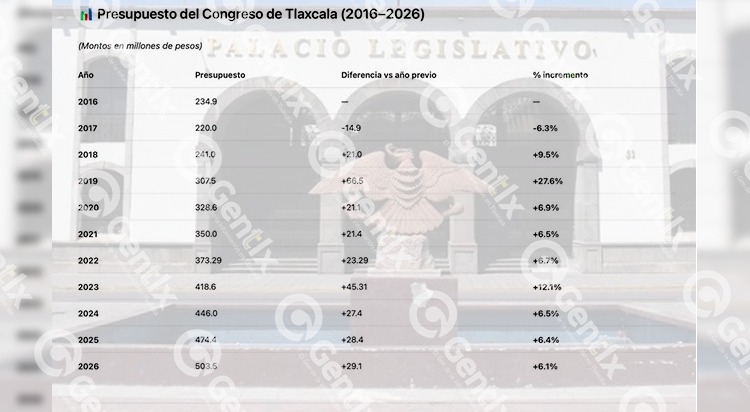 Considerando la partida que se destina al Órgano de Fiscalización Superior de forma anual, el presupuesto del Congreso de Tlaxcala alcanzó en 2026 su nivel más alto al superar los 500 millones de pesos, tras una década marcada por incrementos sostenidos que duplicaron los recursos asignados por la mayoría morenista y sus aliados.