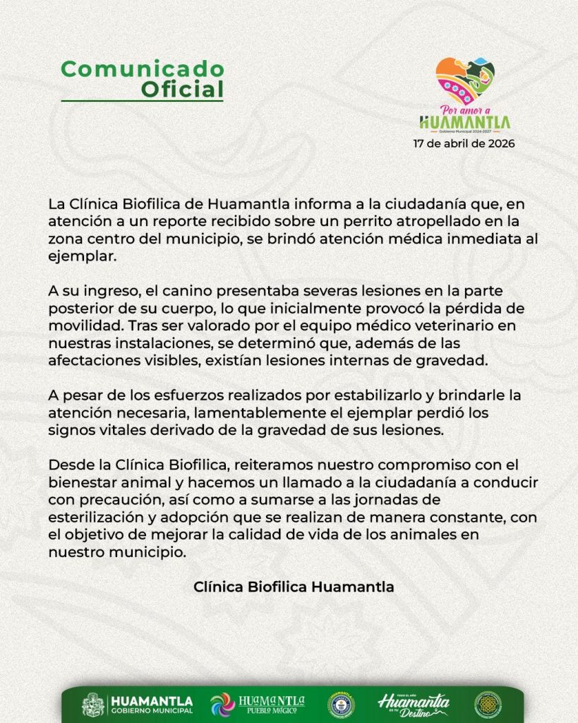 La Clínica Biofilica de Huamantla informa a la ciudadanía que, en atención a un reporte recibido sobre un perrito atropellado en la zona centro del municipio, se brindó atención médica inmediata al ejemplar.