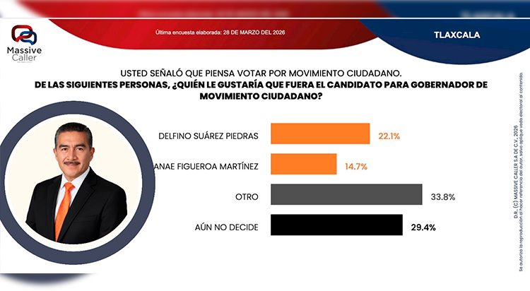 TLAXCALA, Tlax. – En el tablero político que define el futuro de la entidad, las mediciones de las casas encuestadoras de mayor prestigio nacional, como Massive Caller, han arrojado un diagnóstico que no deja lugar a dudas: Delfino Suárez Piedras se ha posicionado como el referente indiscutible y la opción más sólida dentro de Movimiento Ciudadano (MC).