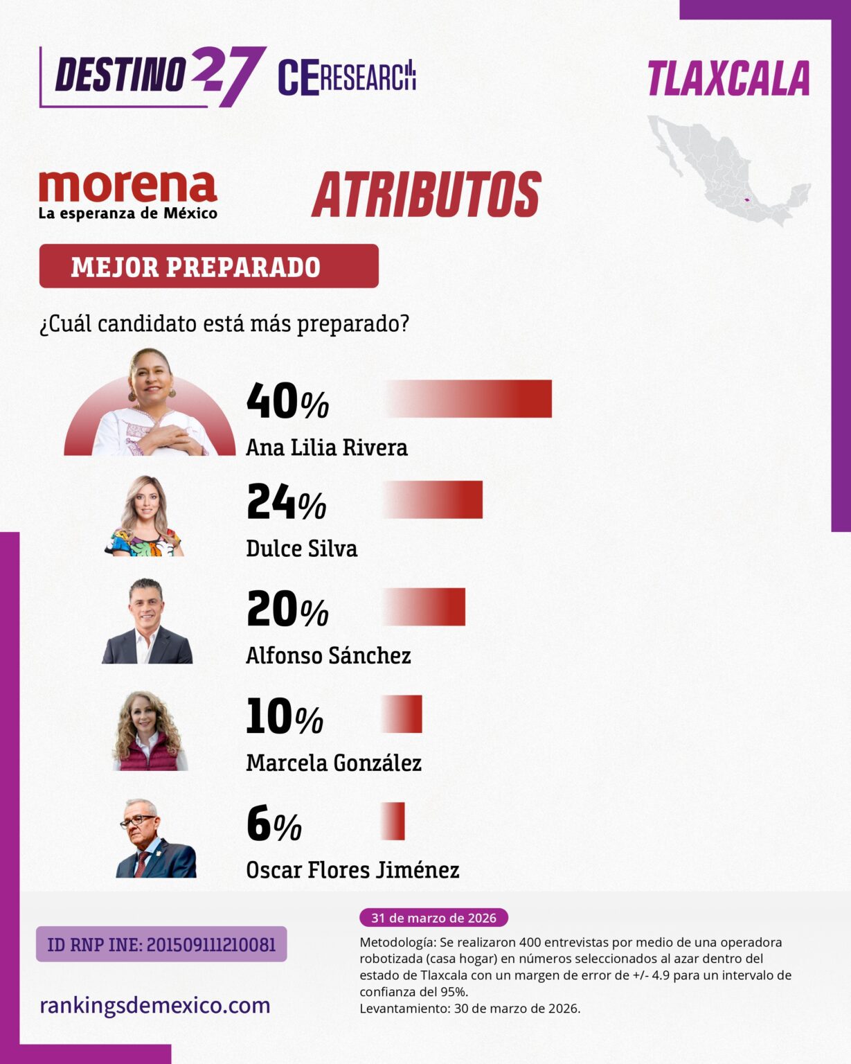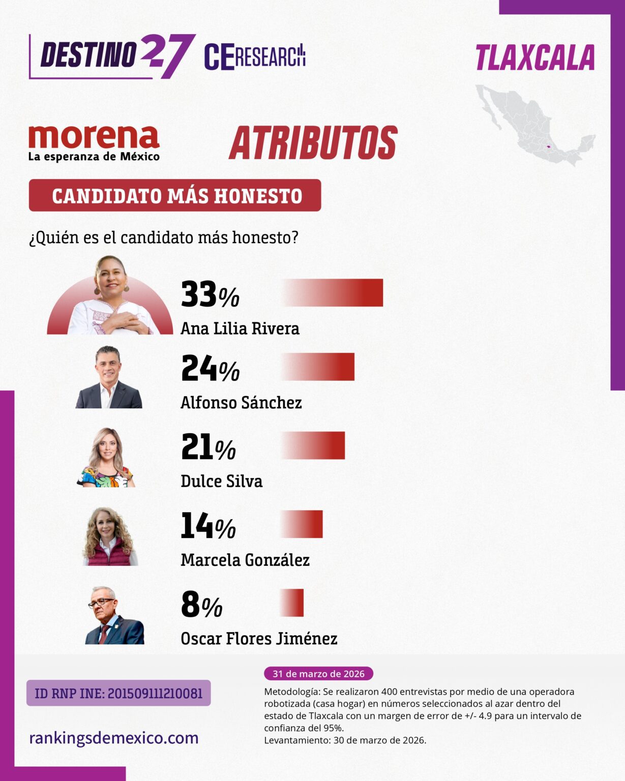 La más reciente medición de Destino 27 de C&E Research colocó a la empresaria y ex diputada federal Dulce Silva con un crecimiento relevante en atributos estratégicos dentro de la contienda interna de Morena por la gubernatura de Tlaxcala.