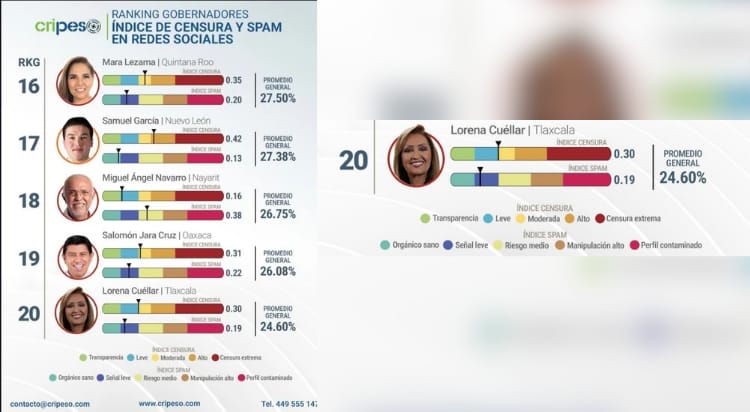 Tlaxcala se posiciona en el centro de la polémica tras la publicación del más reciente informe del CRIPESO, correspondiente a marzo y publicad en abril de 2026, el cual ubica al gobierno encabezado por Lorena Cuéllar Cisneros en el lugar 20 de 32 entidades dentro del Ranking Nacional de Gobernadores en materia de censura y manejo digital.