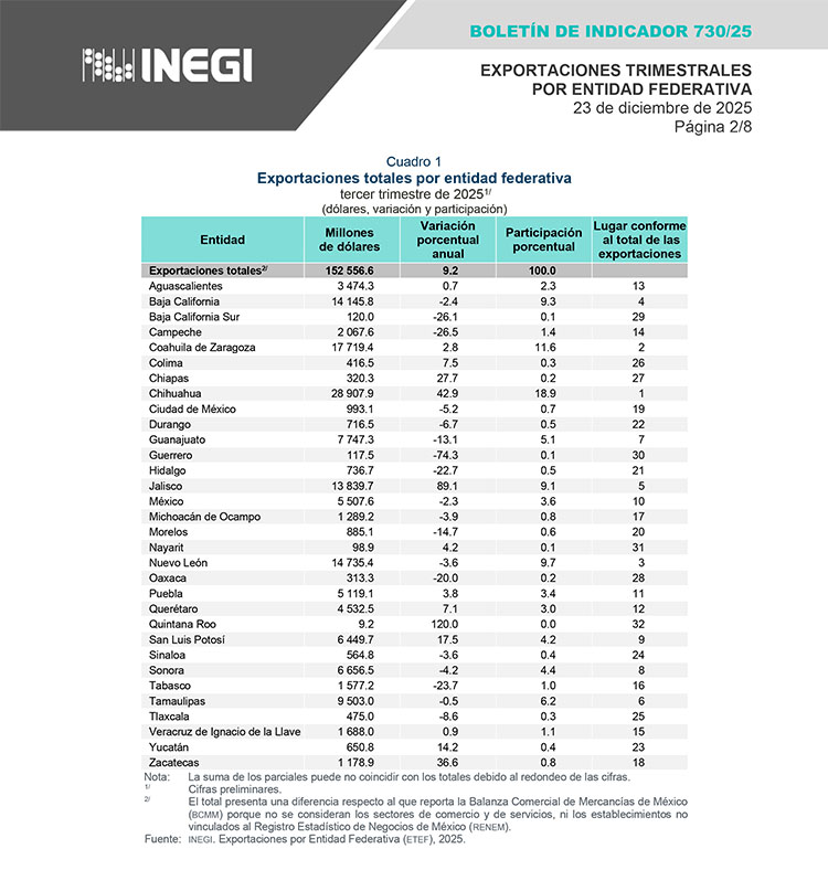 En el lugar 25 de 32 se ubica Tlaxcala en cuanto a exportaciones