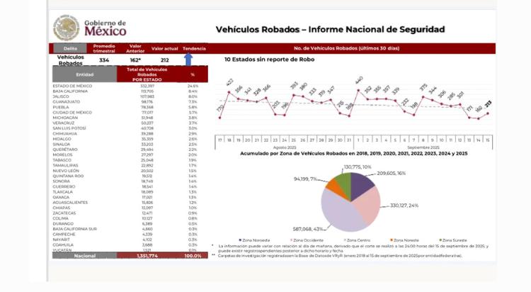 Del 1 de enero de 2018 al 15 de septiembre de 2025, Tlaxcala registra 18,089 robos de vehículos y ocupa el lugar 21 a nivel nacional