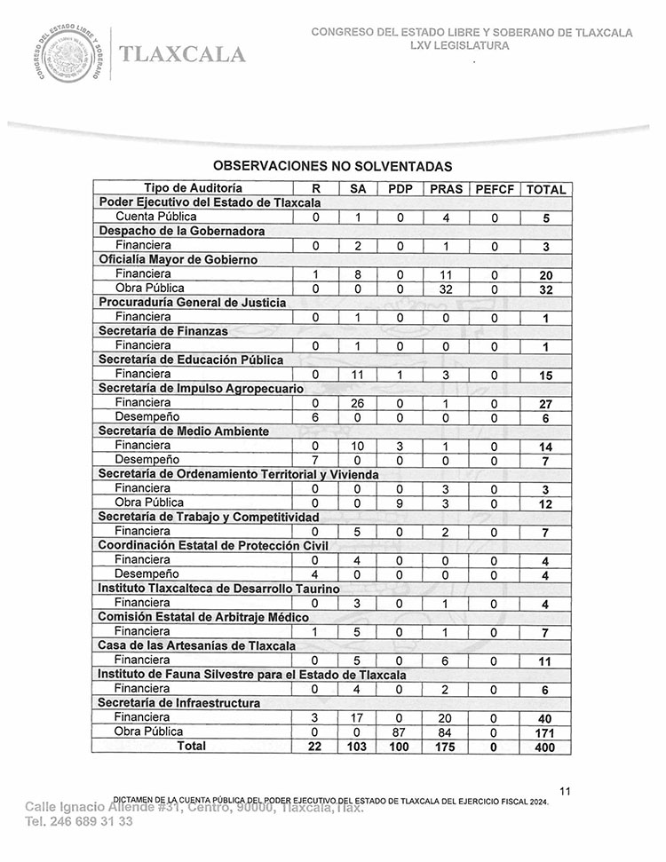Acumuló Poder Ejecutivo Local 400 observaciones por solventar de 2024