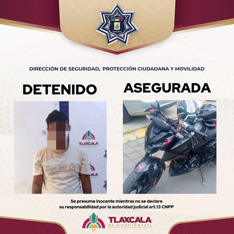 Policía municipal de Tlaxcala asegura a hombre tras intento de robo de motocicleta