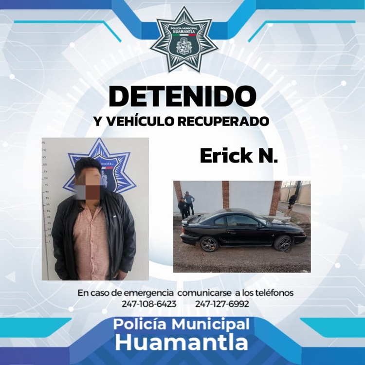 Policía de Huamantla asegura a posible sospechoso de robo de vehículo y recupera el auto