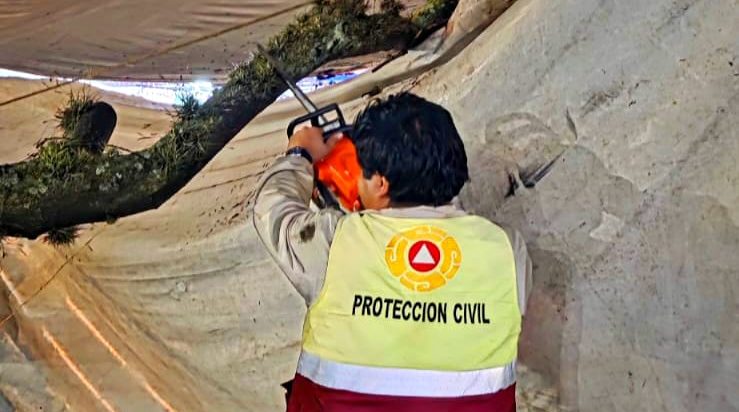 Protección Civil de Chiautempan atiende reporte de árbol caído por fuerte lluvia en Parque Hidalgo